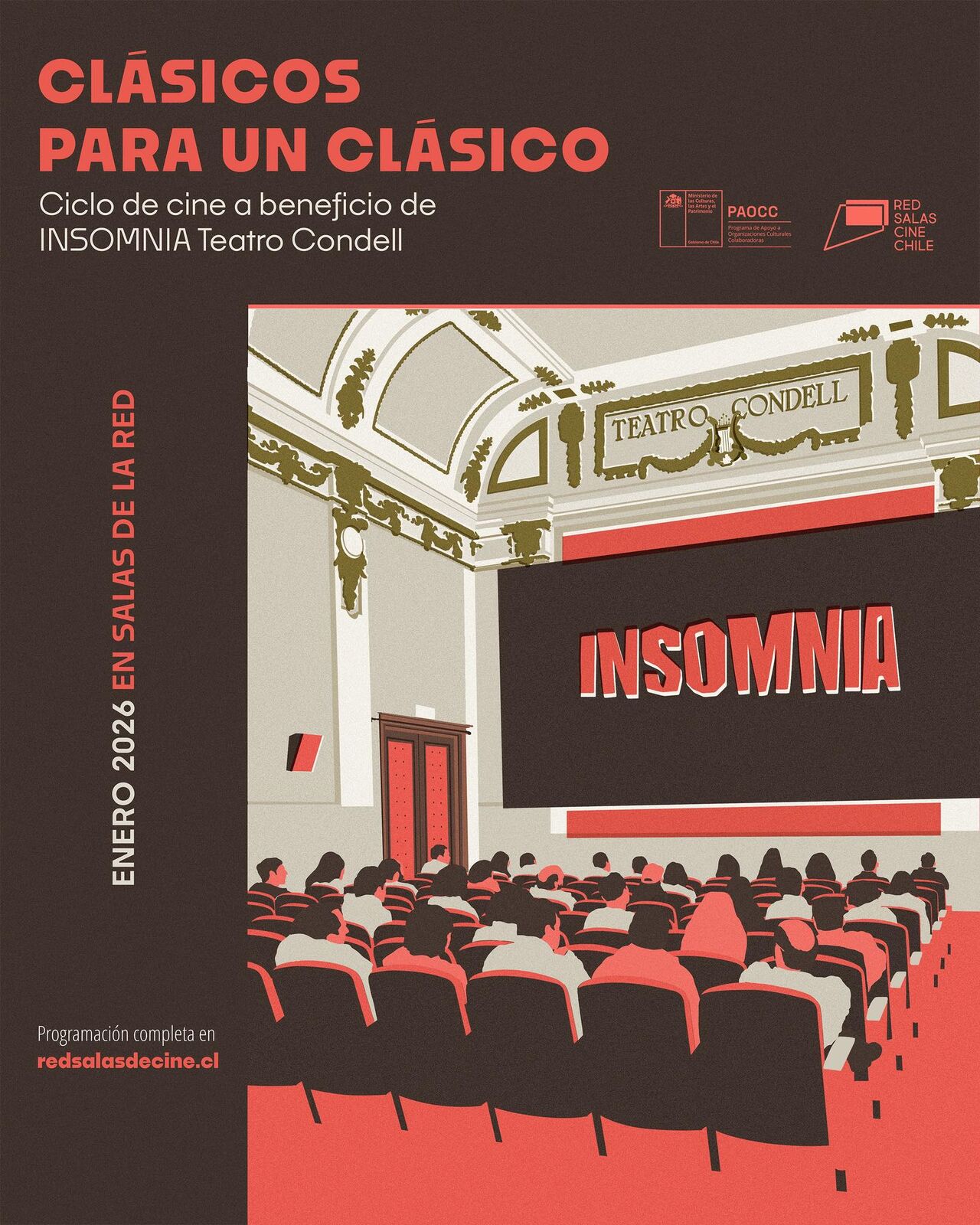‘Clásicos para un clásico’ es el ciclo organizado por la Red Salas Independientes de Cine Chile para recaudar fondos en apoyo a la emblemática sala INSOMNIA Teatro Condell de Valparaíso, que atraviesa una compleja crisis financiera, hecha pública a mediados de diciembre de 2025. Por este motivo, la Red de Salas levantó una programación especial con el objetivo de apoyar económicamente al espacio porteño, reuniendo grandes títulos del cine en distintas salas de la Red, de norte a sur del país, donde destacan Antes del atardecer dirigido por Richard Linklater, Cuando Harry conoció a Sally, dirigido por Rob Reiner, y Brazil, dirigido por Terry Gilliam.