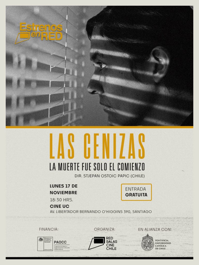 Las cenizas llega a las salas de la Red como parte de ESTRENOS EN RED, iniciativa que busca dar pantalla al cine chileno y latinoamericano que no tiene distribución comercial en el país.